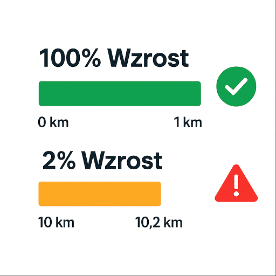 ktoś, kto przebiegł 1 km zaczynając od zera, może mówić o 100% wzroście, ale ktoś inny, kto startował z 10 km, a przebiegł (w tym roku) dodatkowo tylko 200 metrów, osiągnął zupełnie inny wynik – choć procentowo wygląda to inaczej.
